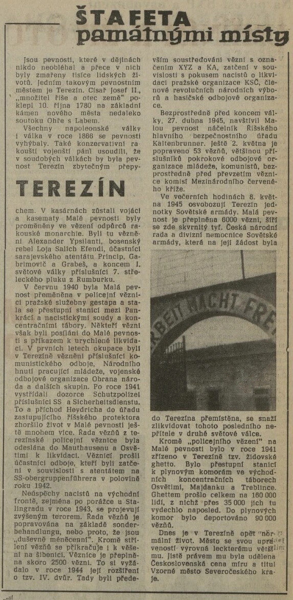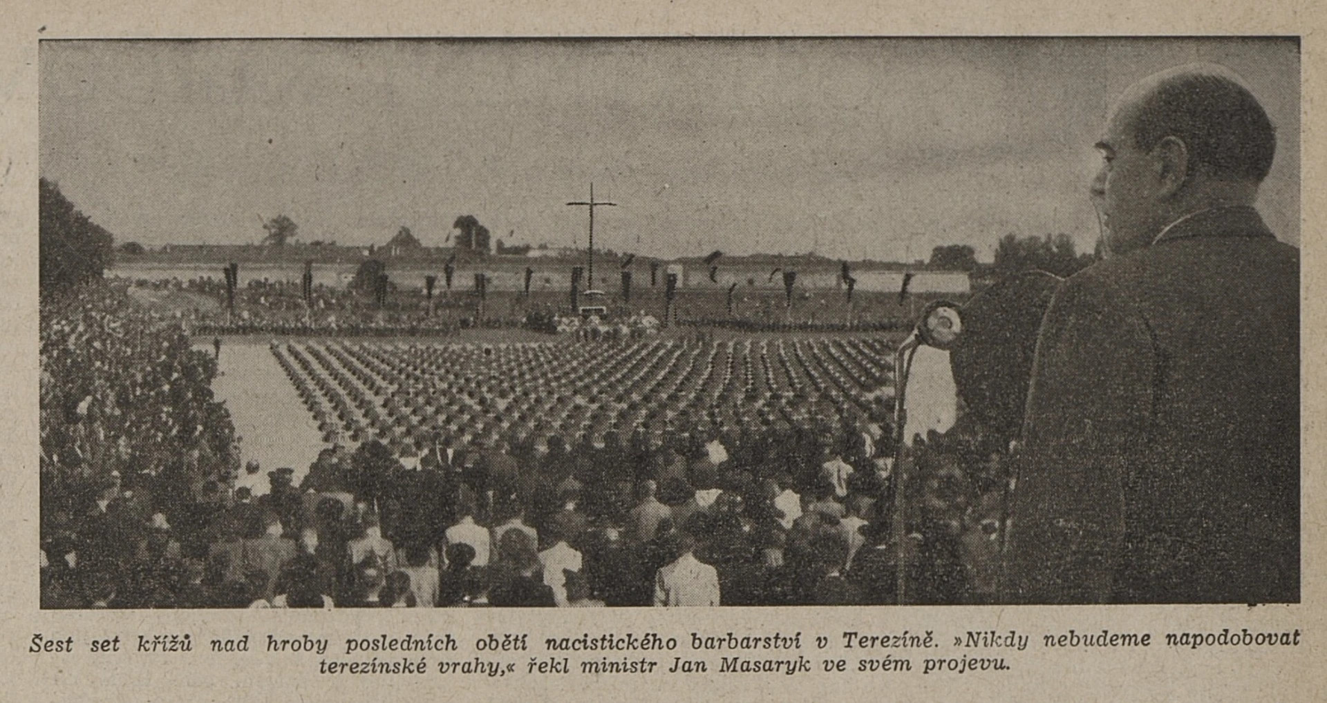 A přišel Mnichov. Pak 15. březen 1939. Nejlepší naši lidé mizeli v bezedném propadlišti koncentračních táborů. Rachot kulometů a svištění guillotiny neustalo od dob Reinharda Heydricha. Když jsme uvykli na zběsilou smrt, která tu šest let chodila mezi námi, strnulí jsme v děsivém pohledu do nejbližší budoucnosti: rozpadající se Německo rvalo celé kusy české země ještě za války pro svoje zmrzačelé invalidy, pod kulomety vedlo české děti do zákopových prací a v poslední křeči se připravovalo na zoufalý zápas o »Festung Böhmen mit der Citadelle Prag«. Národ, do jehož malé země uprostřed Evropy již nezalétají závany větrů z Atlantiku, které osvěžovaly vzduch Belgie, Holandska a Norska, a jenž se nemohl zahledět s vysokých hor Balkánu do dalekého azuru Středozemního moře jako jeho jihoslovanští bratří, ten národ, odkázaný po šest let sám na sebe, věřil i pevněji než kterýkoli národ druhý. Je ovšem těžko mluvit v těch dobách o národu. Jedinci, zahnaní do děr při zákopových pracích, do sklepů svých domů, do mrazivých baráků pracovních táborů, po léta ubíjení goebbelsovskou propagandou a jako Na čtvrtém dvoře, kde rachot nacistických kulometů závodil se skvrnitým tyfem v orgiích smrti, mají dnes Němci dosti času к přemýšlení o svém díku Adolfu Hitlerovi. Šest set křížů nad hroby posledních obětí nacistického barbarství v Terezíně. »Nikdy nebudeme napodobovat terezínské vrahy,« řekl ministr Jan Masaryk ve svém projevu.