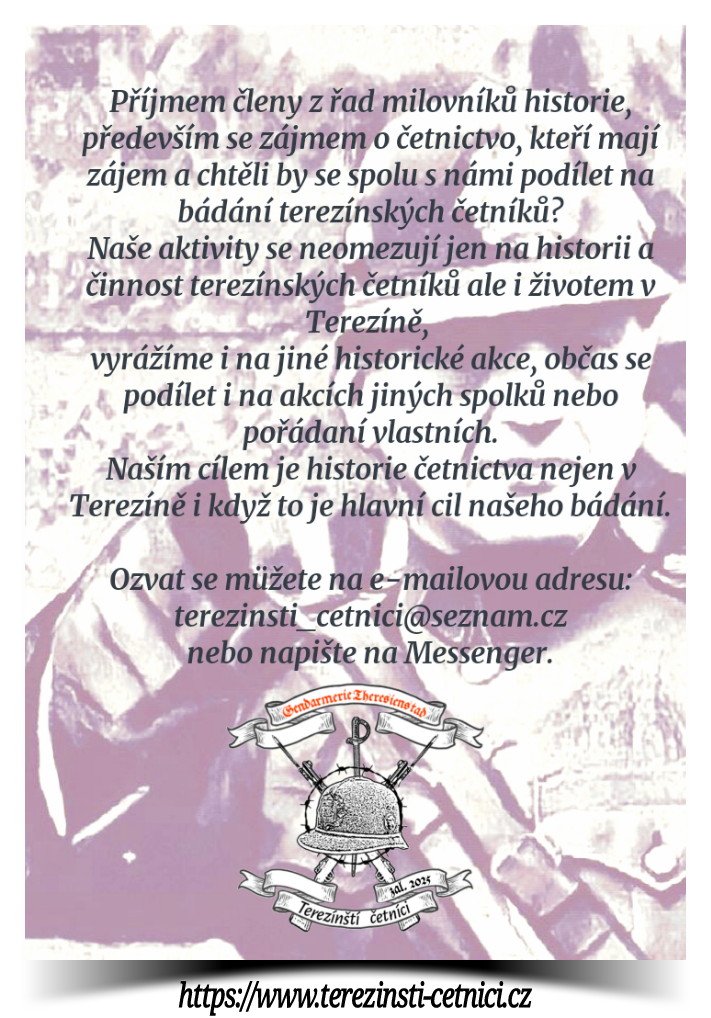 Příjmem členy z řad milovníků historie, především se zájmem o četnictvo, kteří mají zájem a chtěli by se spolu s námi podílet na bádání terezínských četníků?