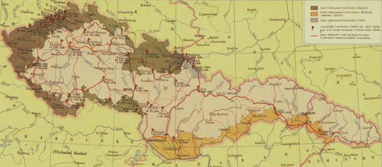 A přišel Mnichov. Pak 15. březen 1939. Nejlepší naši lidé mizeli v bezedném propadlišti koncentračních táborů. Rachot kulometů a svištění guillotiny neustalo od dob Reinharda Heydricha. Když jsme uvykli na zběsilou smrt, která tu šest let chodila mezi námi, strnulí jsme v děsivém pohledu do nejbližší budoucnosti: rozpadající se Německo rvalo celé kusy české země ještě za války pro svoje zmrzačelé invalidy, pod kulomety vedlo české děti do zákopových prací a v poslední křeči se připravovalo na zoufalý zápas o »Festung Böhmen mit der Citadelle Prag«. Národ, do jehož malé země uprostřed Evropy již nezalétají závany větrů z Atlantiku, které osvěžovaly vzduch Belgie, Holandska a Norska, a jenž se nemohl zahledět s vysokých hor Balkánu do dalekého azuru Středozemního moře jako jeho jihoslovanští bratří, ten národ, odkázaný po šest let sám na sebe, věřil i pevněji než kterýkoli národ druhý. Je ovšem těžko mluvit v těch dobách o národu. Jedinci, zahnaní do děr při zákopových pracích, do sklepů svých domů, do mrazivých baráků pracovních táborů, po léta ubíjení goebbelsovskou propagandou a jako Na čtvrtém dvoře, kde rachot nacistických kulometů závodil se skvrnitým tyfem v orgiích smrti, mají dnes Němci dosti času к přemýšlení o svém díku Adolfu Hitlerovi. Šest set křížů nad hroby posledních obětí nacistického barbarství v Terezíně. »Nikdy nebudeme napodobovat terezínské vrahy,« řekl ministr Jan Masaryk ve svém projevu.