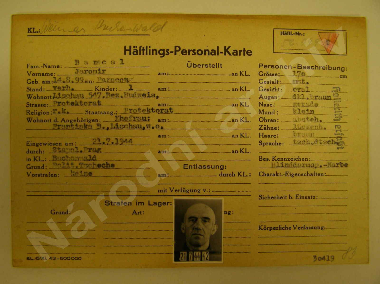 Táborové číslo 52999, kategorie vězňů polit.tscheche, datum transport 21. 7. 1944 předal stapol. Prag transport do KT Buchenwaldu.