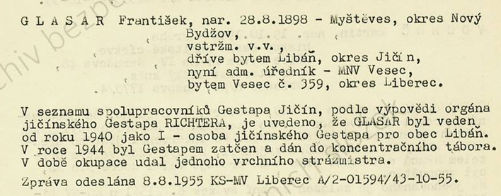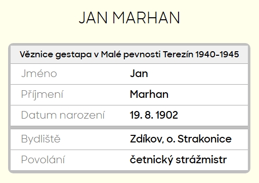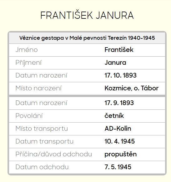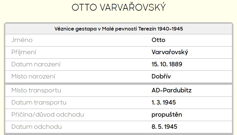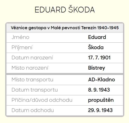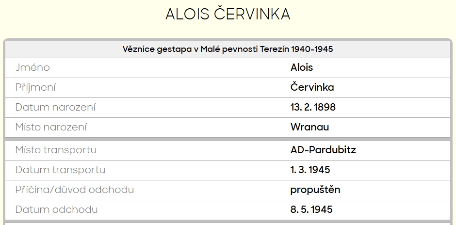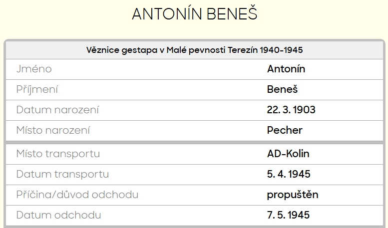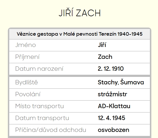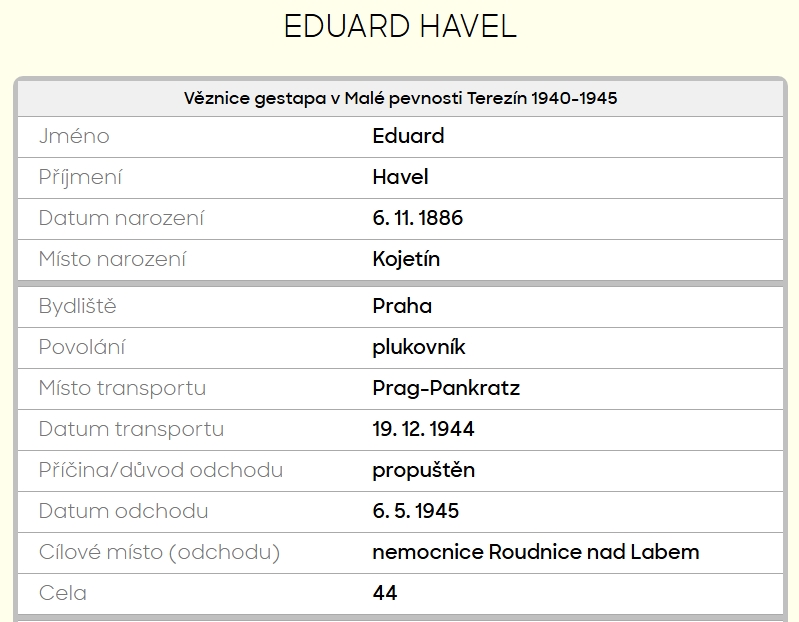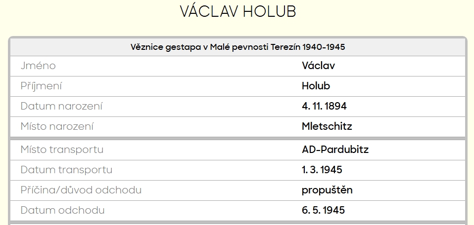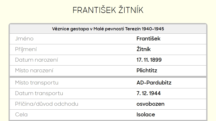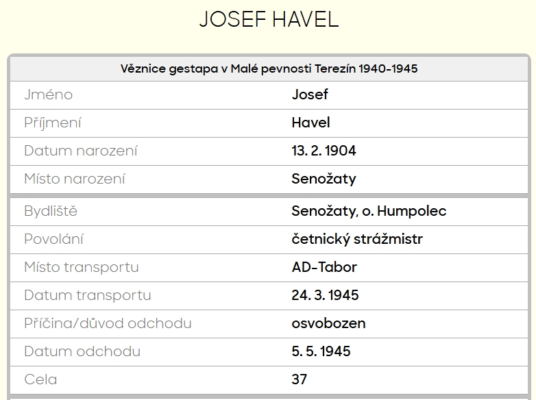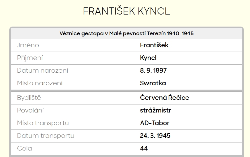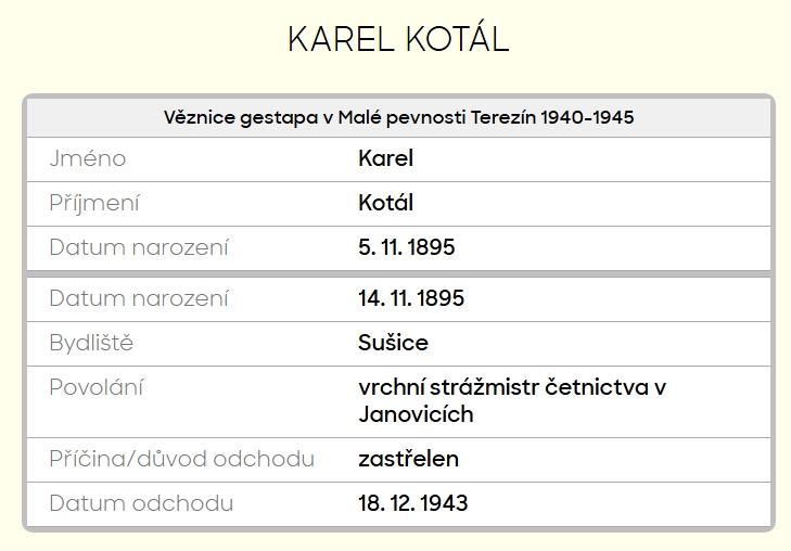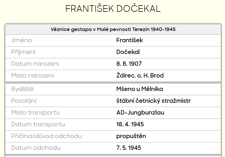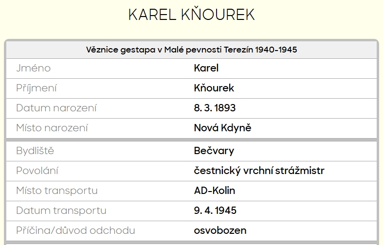 Strážmistr četnictva, Kropáčova Vrutice, zatčen 13. 06. 1944 přežil a vrátil se z Terezína po osvobození.