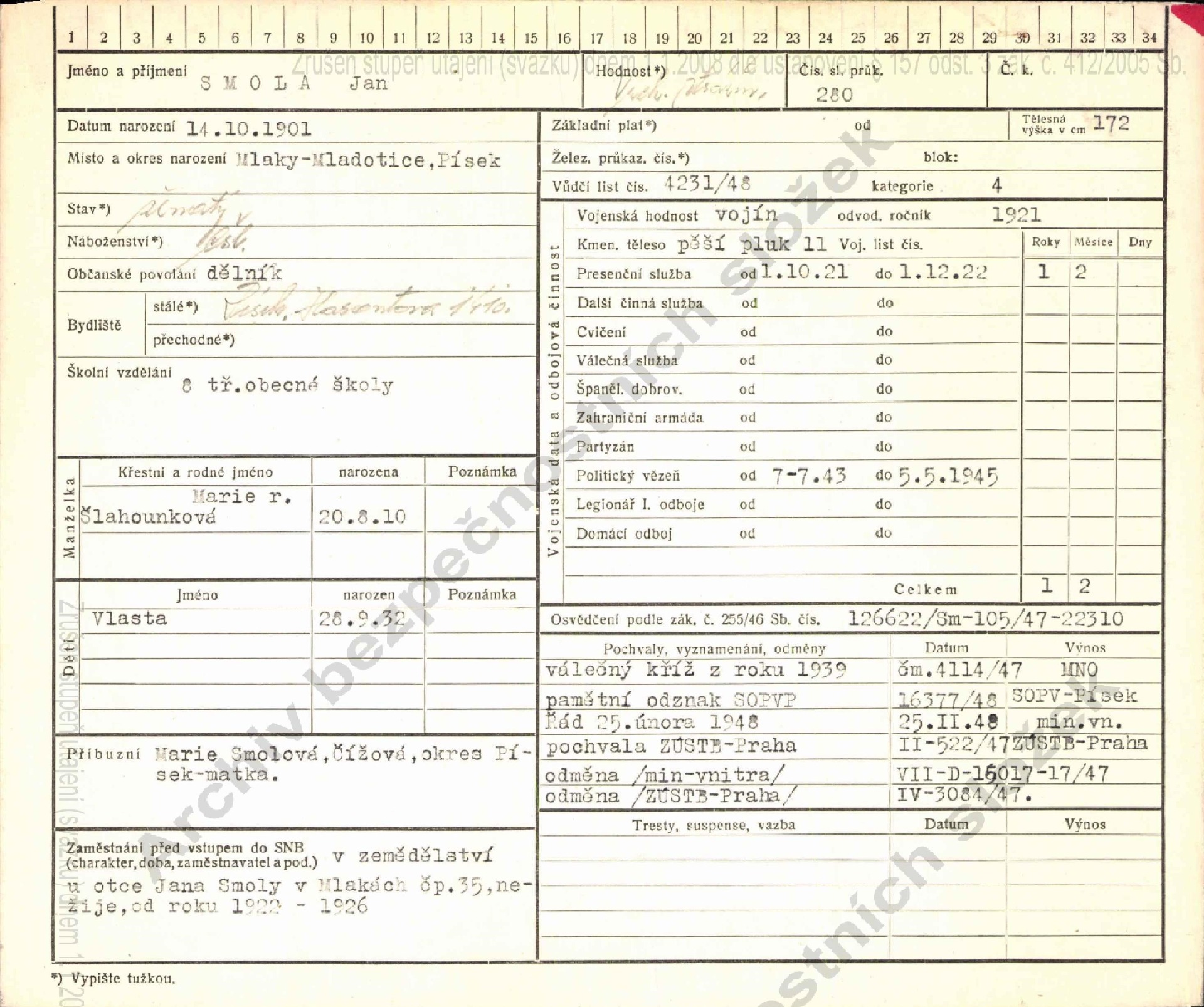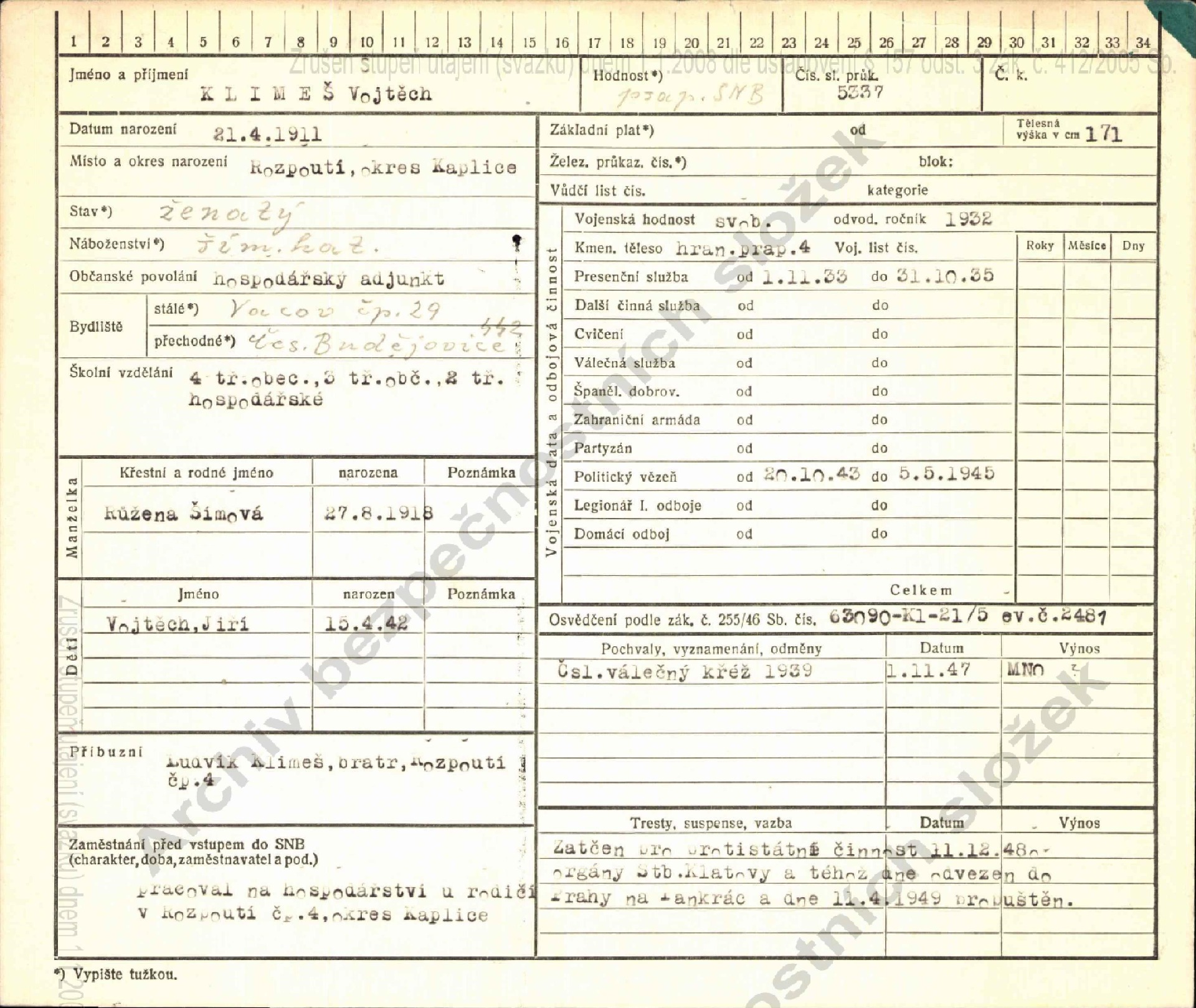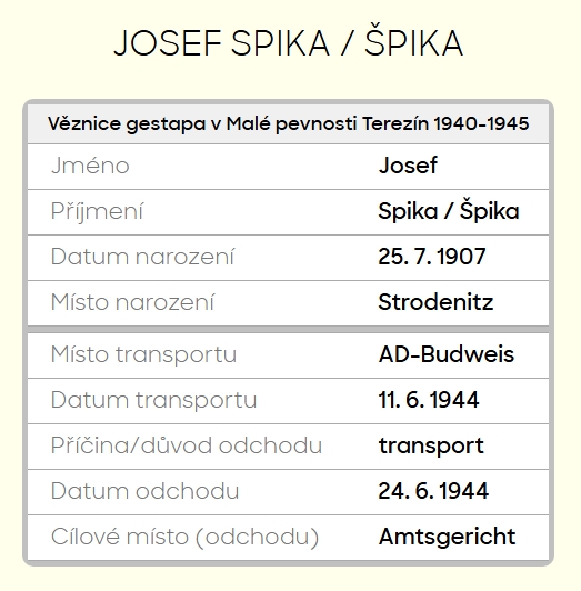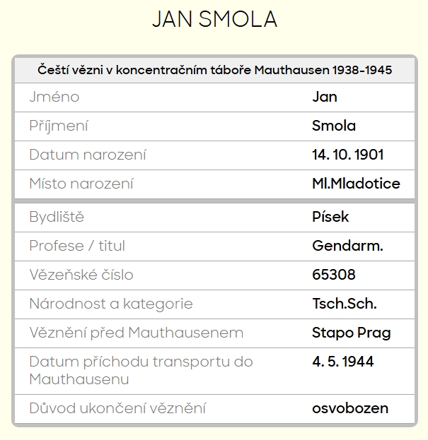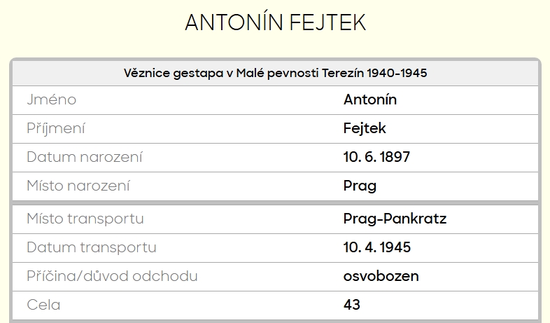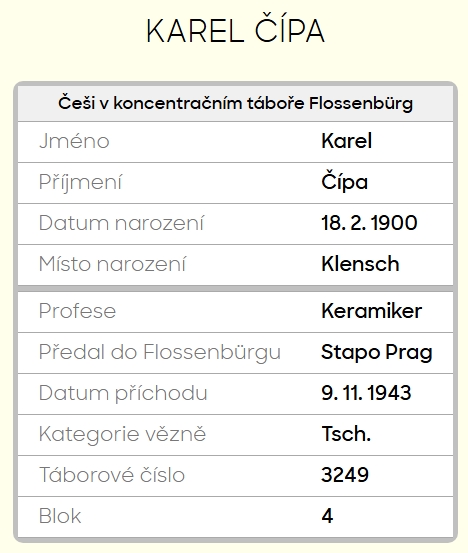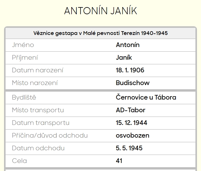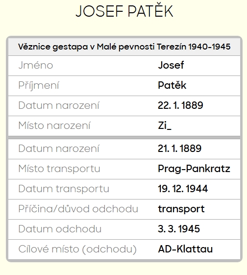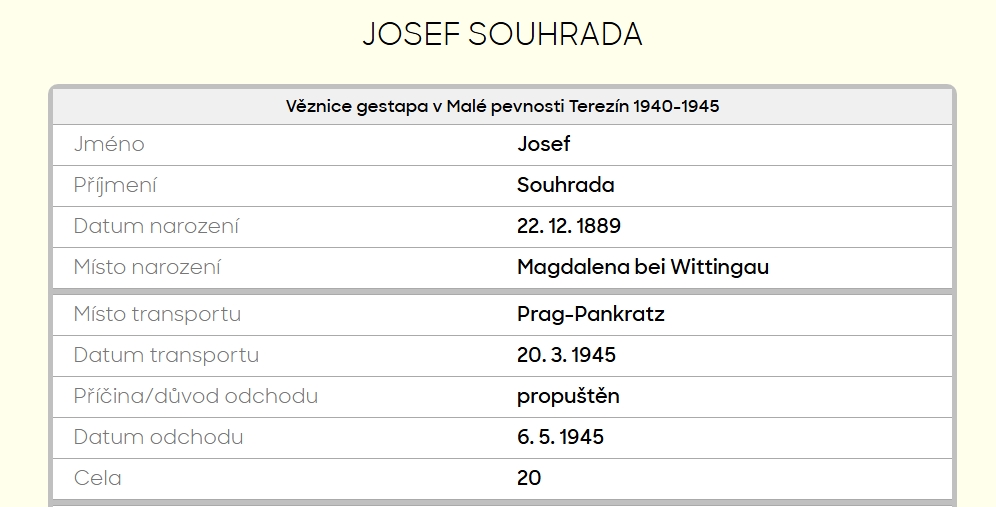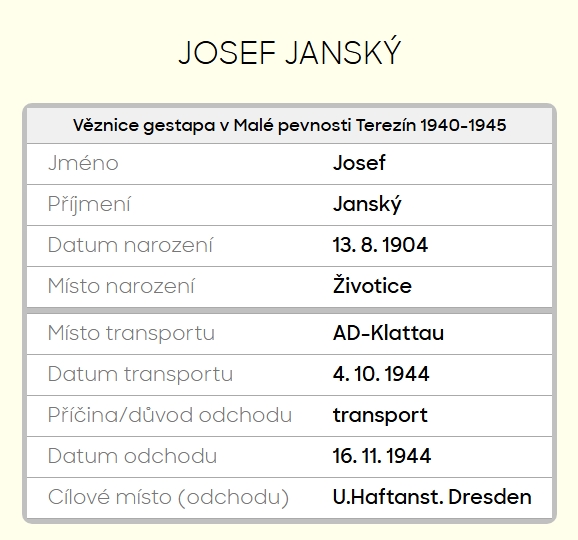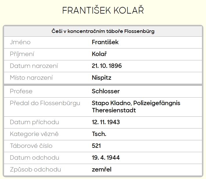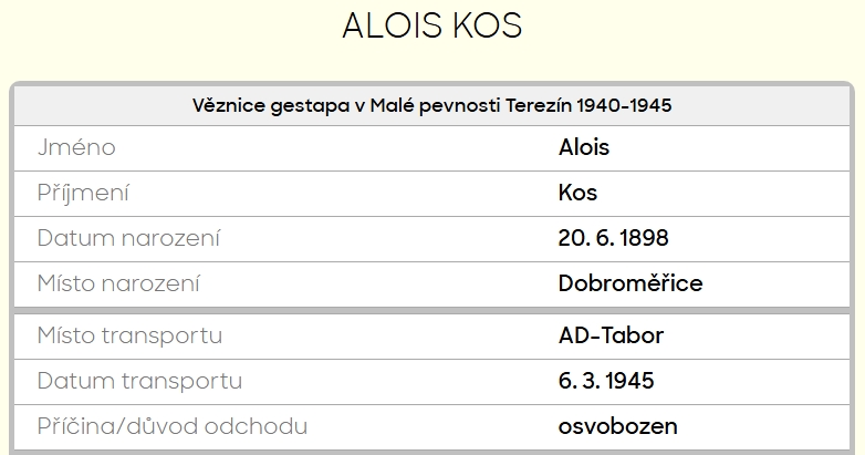 Zatčen 7.9.1943 Stapo České Budějovice Flossenbürg čis. vězně 6093 poté v Litoměřicích 88622 transport G1 Gross-Rosen" vrátil se