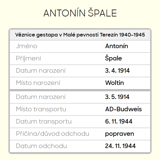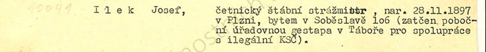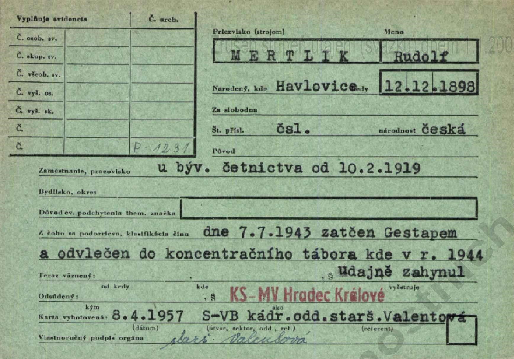 Zatčen poboční úřadovnou gestapa Hradec Králové pro spojení s ilegálně žijícími funkcionáři odbojového hnutí ilegalní KSČ.