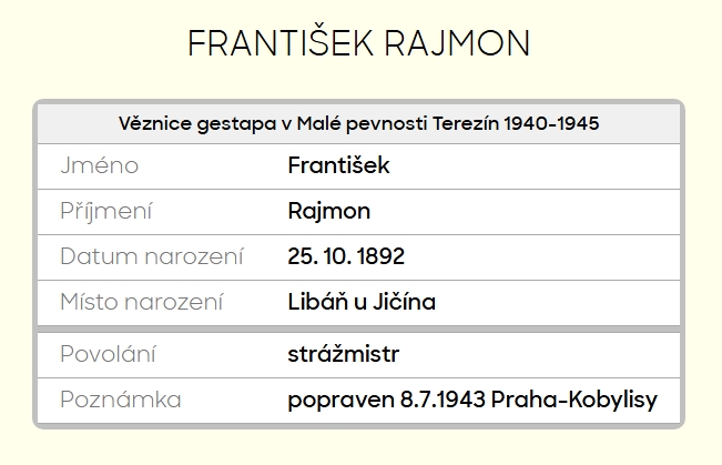 Vrch. strážm. František Zajíc (nar. 19. 3. 1892) z četnické stanice Železnice, zatčený 22. října 1940, vězněný v Kartouzách, Vrchlabí, Litoměřicích, Terezíně a Vratislavi (Breslau). Zemřel na následky útrap 5.5.1945.