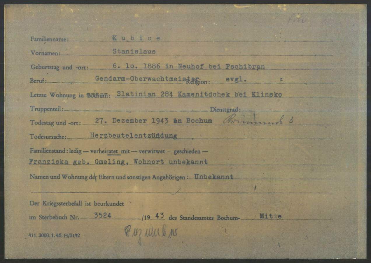 ... únor 1945 Neckarelz – asi 10.3.1945 zemřel – pohřben ve společné šachtě.