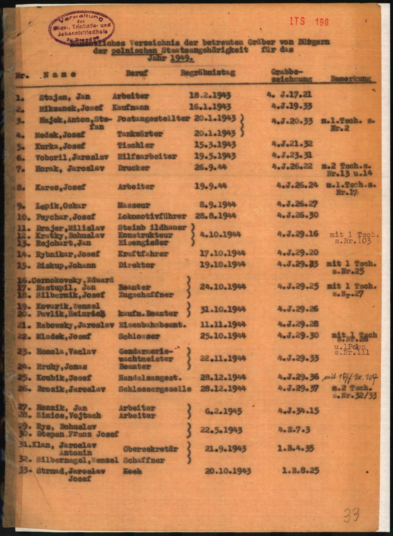 kartotéka pohřbených na národním hřbitově v Terezíně, číslo hrobu 16, číslo oddělení 1