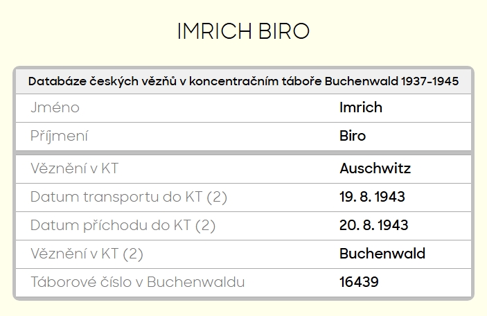 Bíro byl převezen do Buchenwaldu s transportem z Osvětimi, přijíždí 20.8. 1943. Podle záznamu v jednom z jeho dokumenty, byl zatčen za neuposlechnutí rozkazů, které dostal ("Befehle nicht gehorsam", dokument 5546667 na Arolsen online archiv). Po příjezdu do Buchenwaldu mu bylo přiděleno vězeňské číslo 16439 a byl umístěn v bloku 63 malého tábora. Skenování seznamu vězňů, kteří dorazili 20.8.1943 a byli ubytováni v bloku 63.