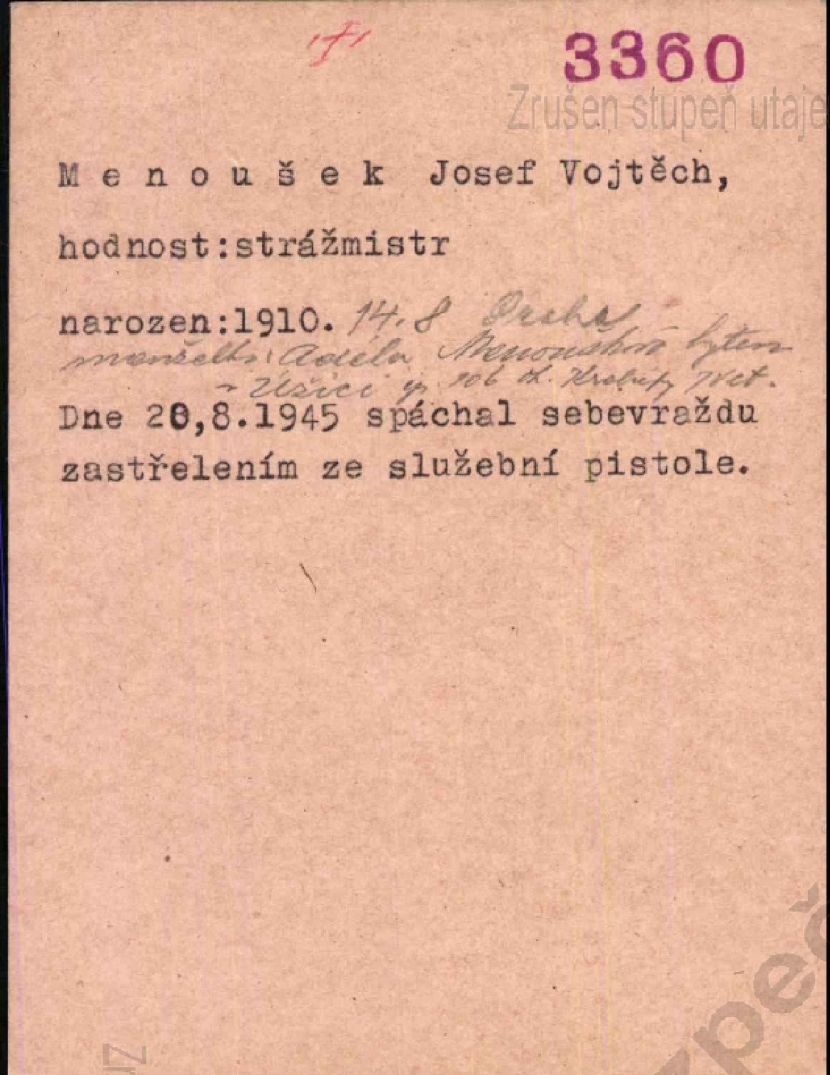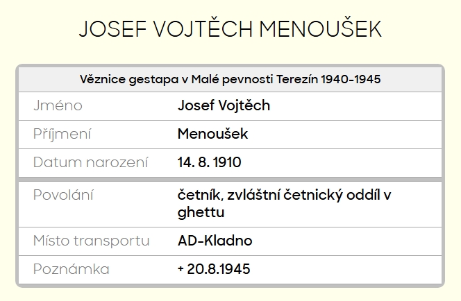 Příslušník zvláštního četnického oddílu v Terezíně Josef Menoušek byl zatčen pro pomoc vězňům. Z vazby byl uvolněn 11. února 1943 a po disciplinárním řízení propuštěn ze služby.