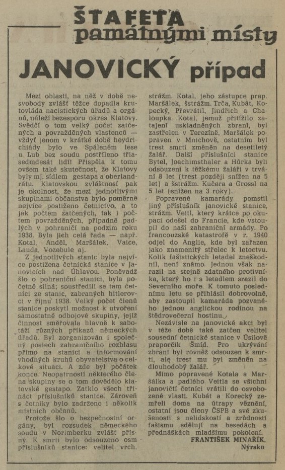 Jeho nejbližší spolupracovník byl št. štrážmistr Kratochvíl z Lošan okr. Kolín krycím jménem Mráček.