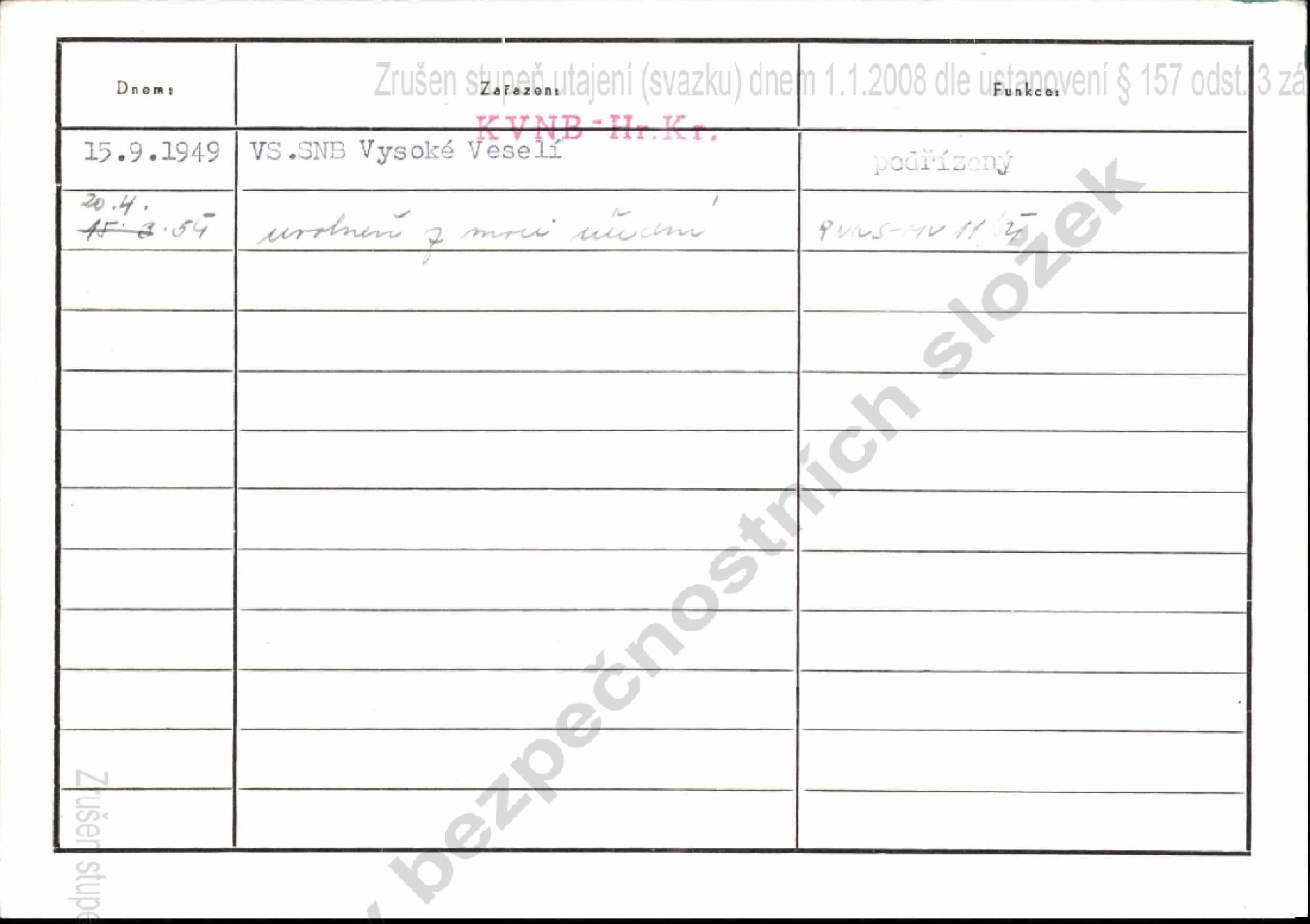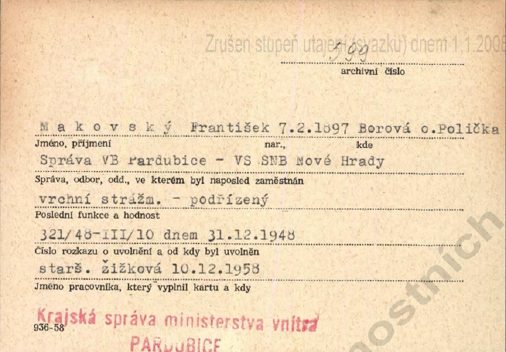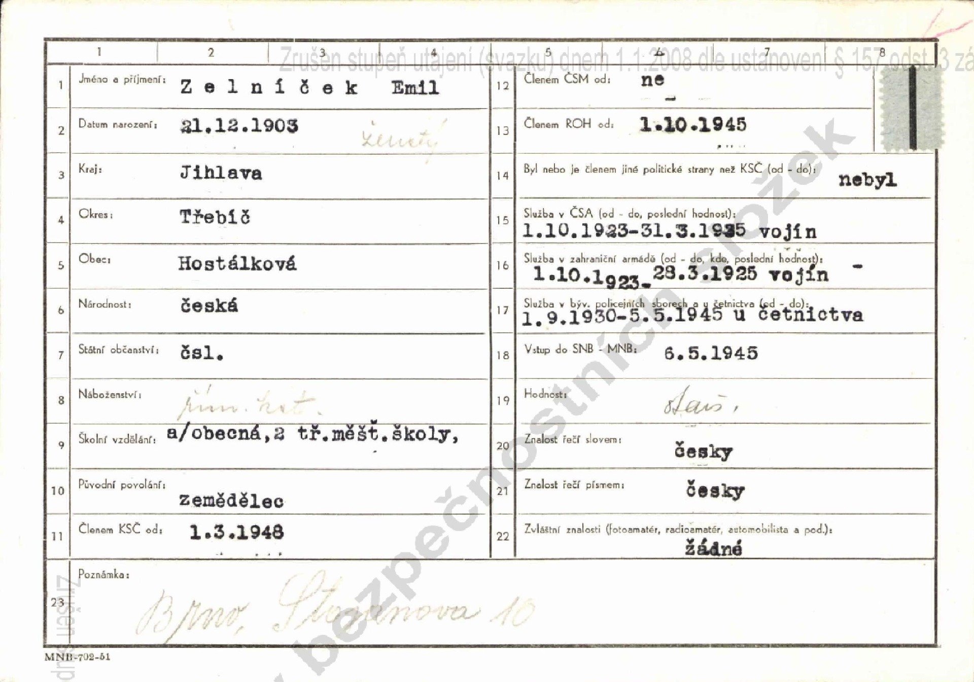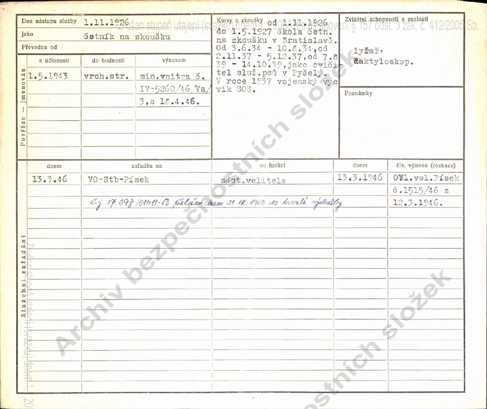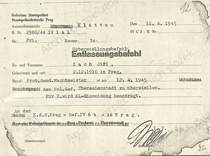 Příslušník četnictva stanice Dolní Bukovsko okres Třeboň v Čechách odvelen do četnictva zvláštního oddílu Terezín v Čechách.