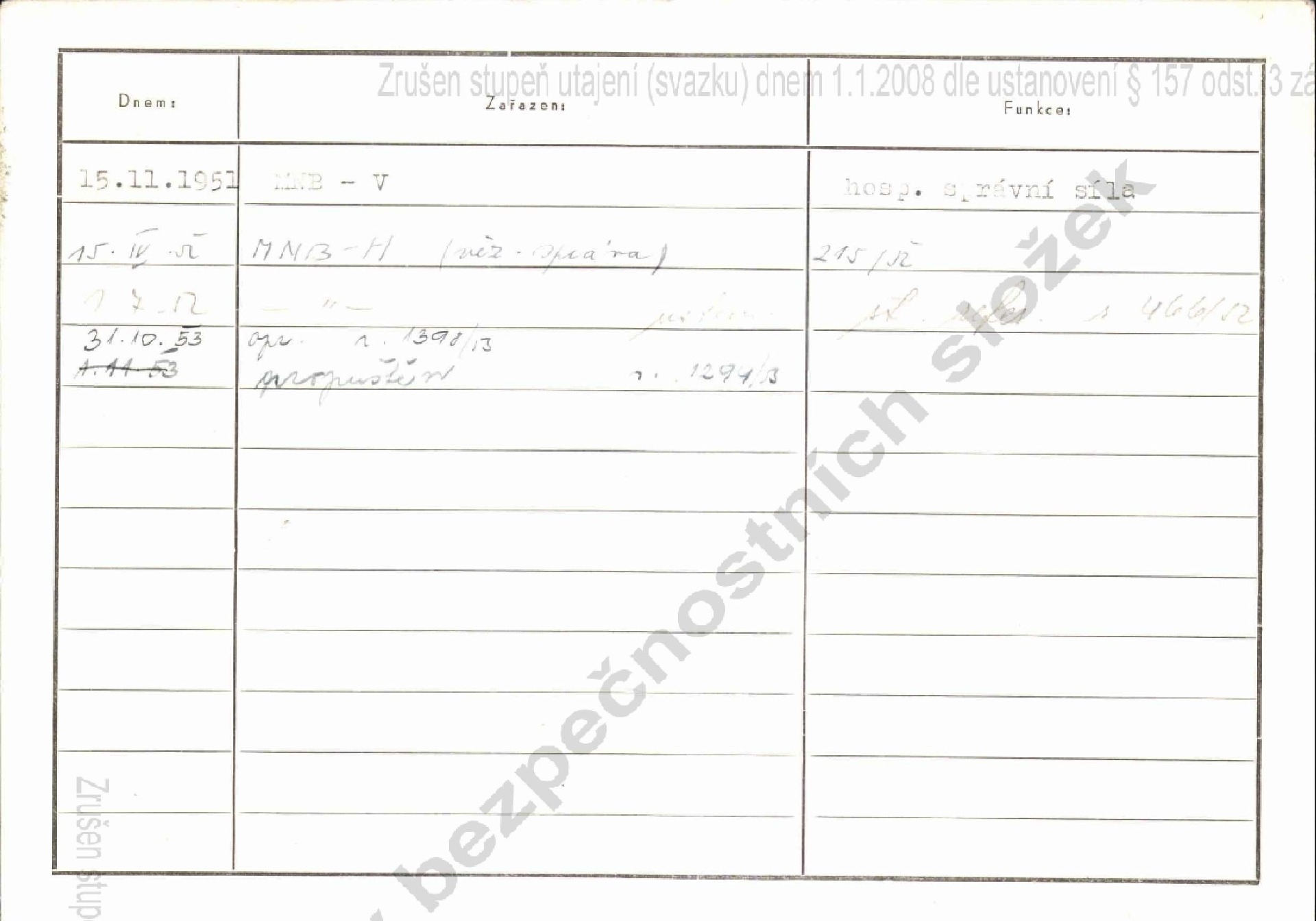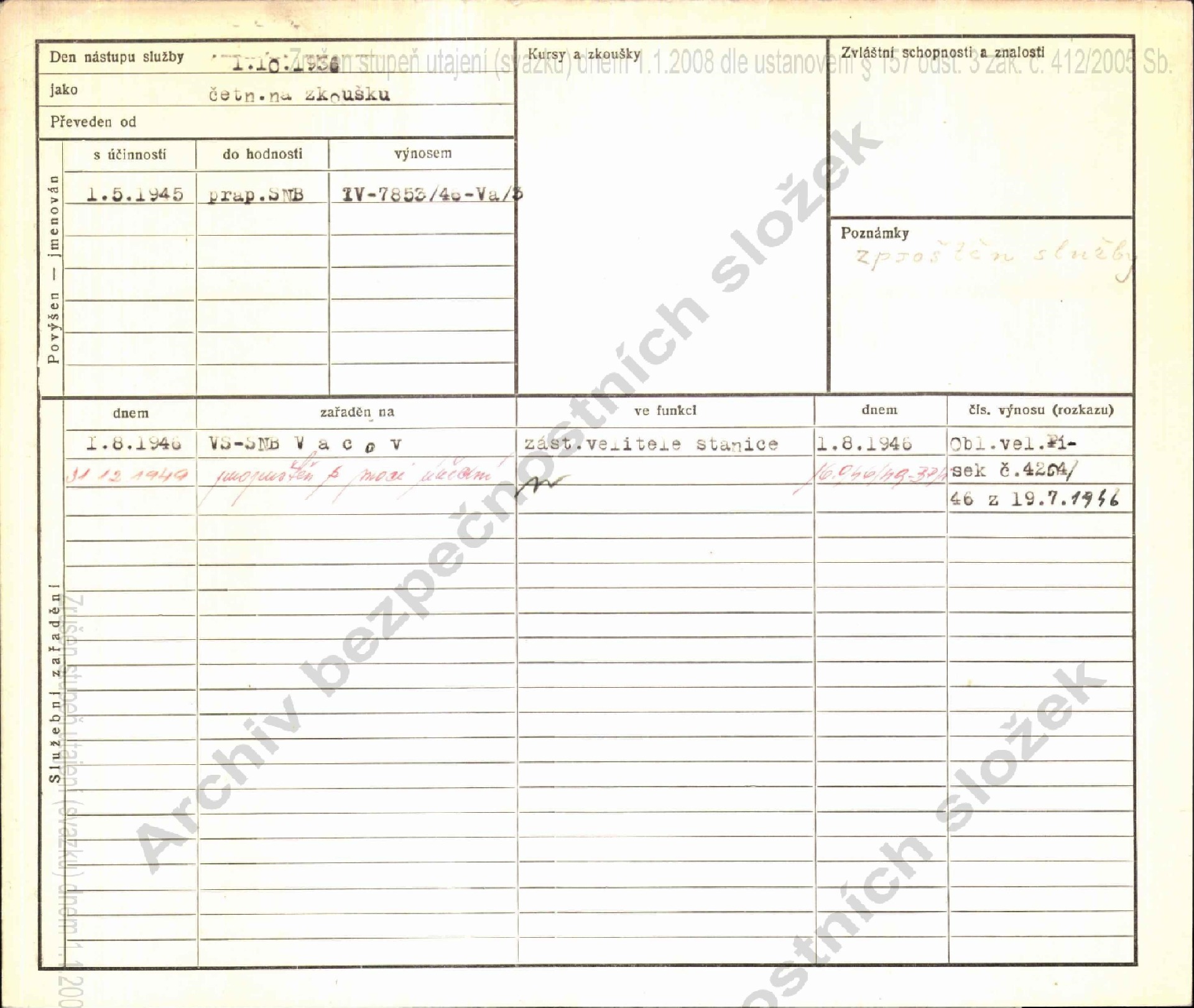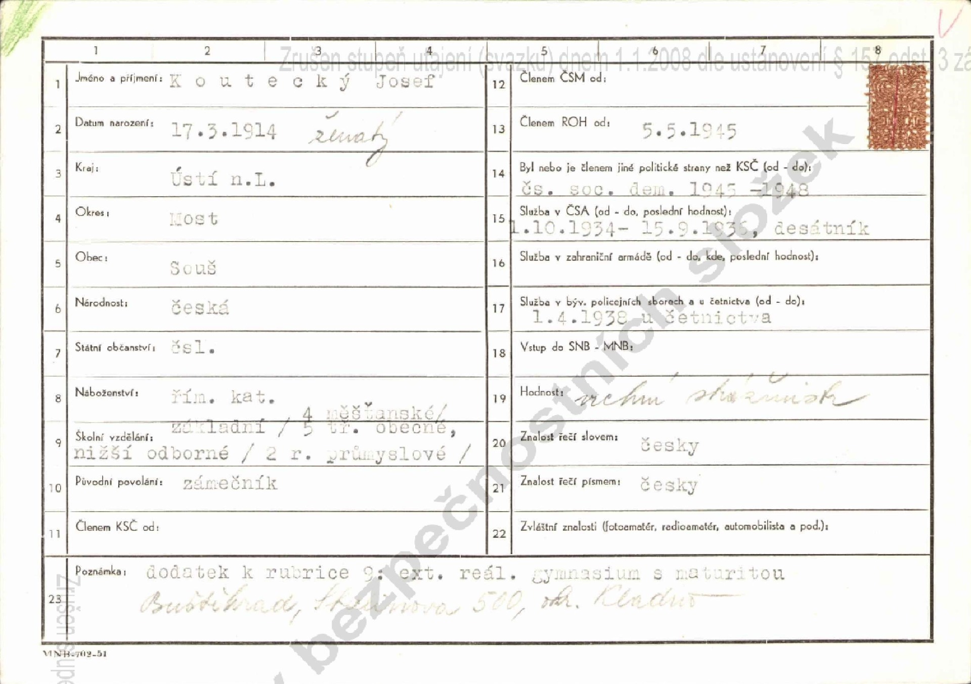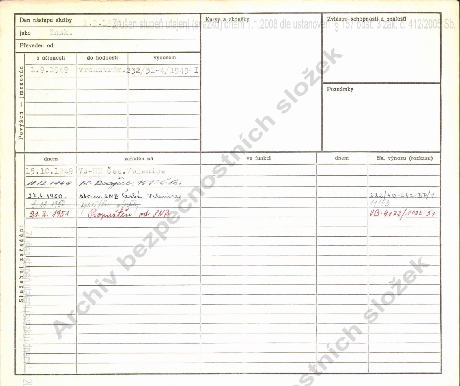 Příslušník četnictva stanice Dolní Bukovsko okres Třeboň v Čechách odvelen do četnictva zvláštního oddílu Terezín v Čechách.
