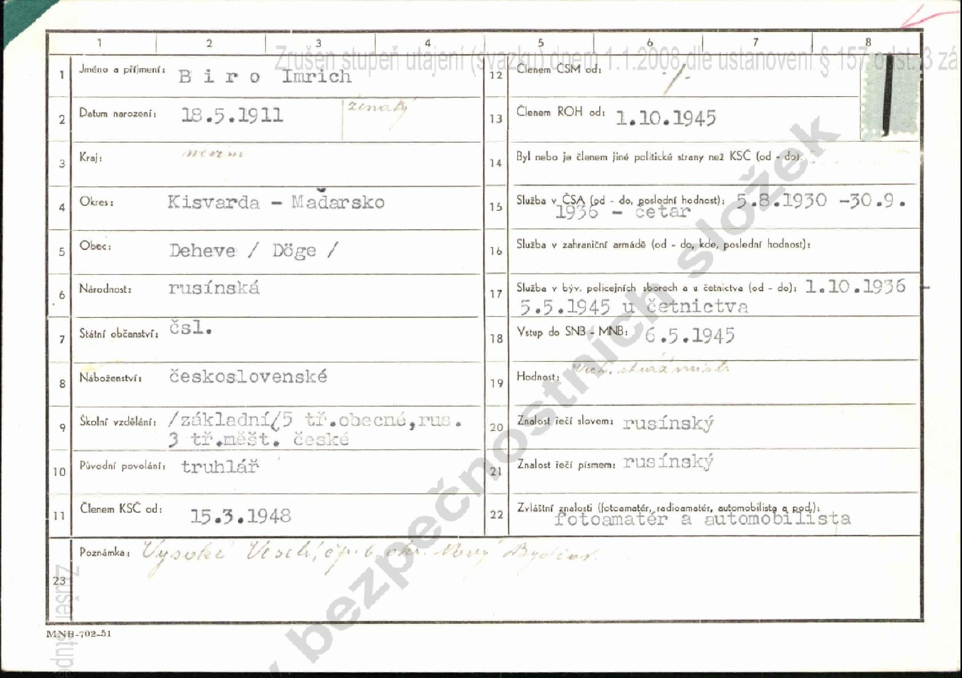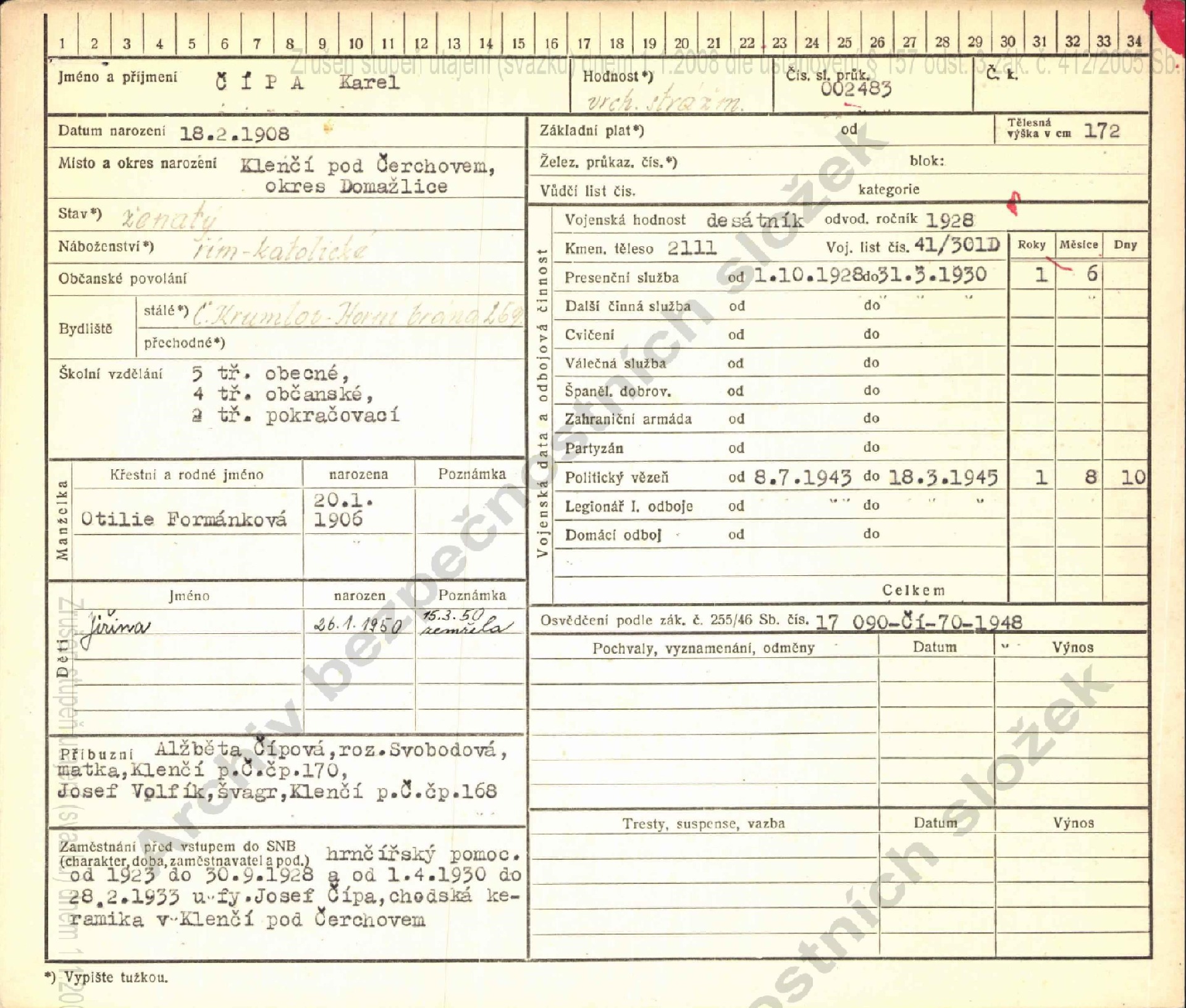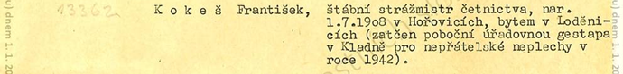 anotace: četnický strážmistr, zatčen 31. 7. 1943 v Petrovicích u Domažlic.