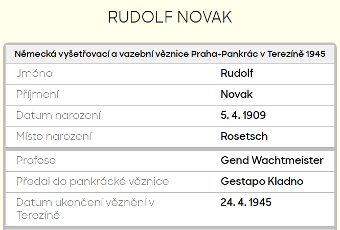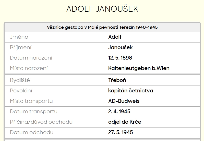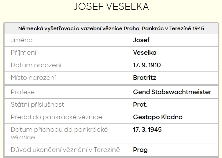 Štábní strážmistr-stanice Újezd nad lesy, okr. Říčany, zatčen 19.července 1943 odsouzen ke 4 letům vězení, příslušník četnictva stanice Újezd nad Lesy v Čechách odvelen do zvláštního četnického oddílu v Terezíně v Čechách. Byl zatčen 19.7.1943 pro pomoc vězněným osobám. Byl odsouzen na čtyři roky vězení a zemřel dne 18.4.1945 v Malé pevnosti Terezín.