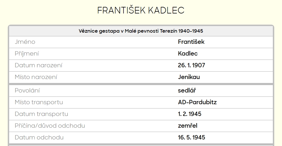 Zemřel na následky útrap 5.5.1945 Lysá nad Labem, Nymburk