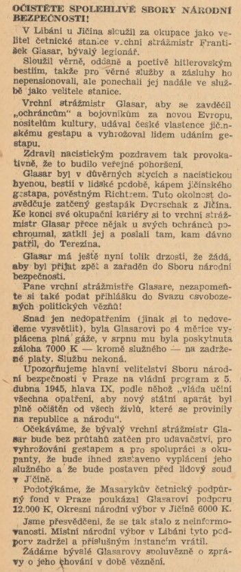 Již tato okolnost svědčí o tom, že požíval důvěry a sympatii našich bratři. Bez něho a jeho účinné spolupráce se u nás nic nepodnikalo. Také on vnášel do všeho našeho podnikáni jen positivní podněty a pravé kamarádství. A tak byl pro všechny jen milým Jarkou, ochotný ku práci, pomoci i zábavě. Ani on se nesmířil s údělem, který nám chtěla určit okupační moc. Dobrý voják z legií a neméně dobrý četník, sloužící věrně své republice, nastoupil nebezpečnou cestu odporu proti okupantům. Shromažďoval zbraně a myslel jen na chvíli, aby jích mohl se svými druhy užit proti vetřelcům. Toho se bohužel nedočkal. šel touže cestou a utržil neméně ran a trýznění jako on. Šli touto kalvárii společně od začátku a společně také ukončili svůj život. Jen s tou výjimkou pro Vozobule, se ho na čas poslali do Golnovské trestnice. Bratru Jarkovi se těžko umíralo. I jeho mysl zalétala domů ke dvěma dětem a manželce, která v době jejich klidného života ho dobře doplňovala svým neutuchajícím humorem a radosti ze života. — Co říci nakonec: jen to, že je vás, hoši milí, tolik, tolik škoda — pro vaše rodiny i pro nás, kteří s vámi v legionářském bratrstvu tak úzce srostli, i pro republiku, jejímiž oddanými vojáky a pracovníky jaté byli. Čest vám!