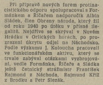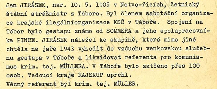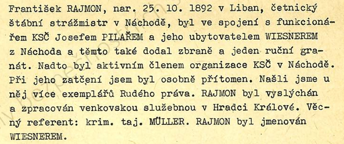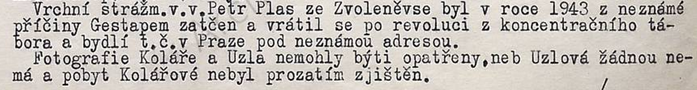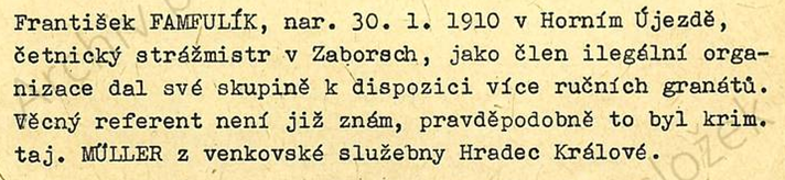 Jeho nejbližší spolupracovník byl št. štrážmistr Kratochvíl z Lošan okr. Kolín krycím jménem Mráček.