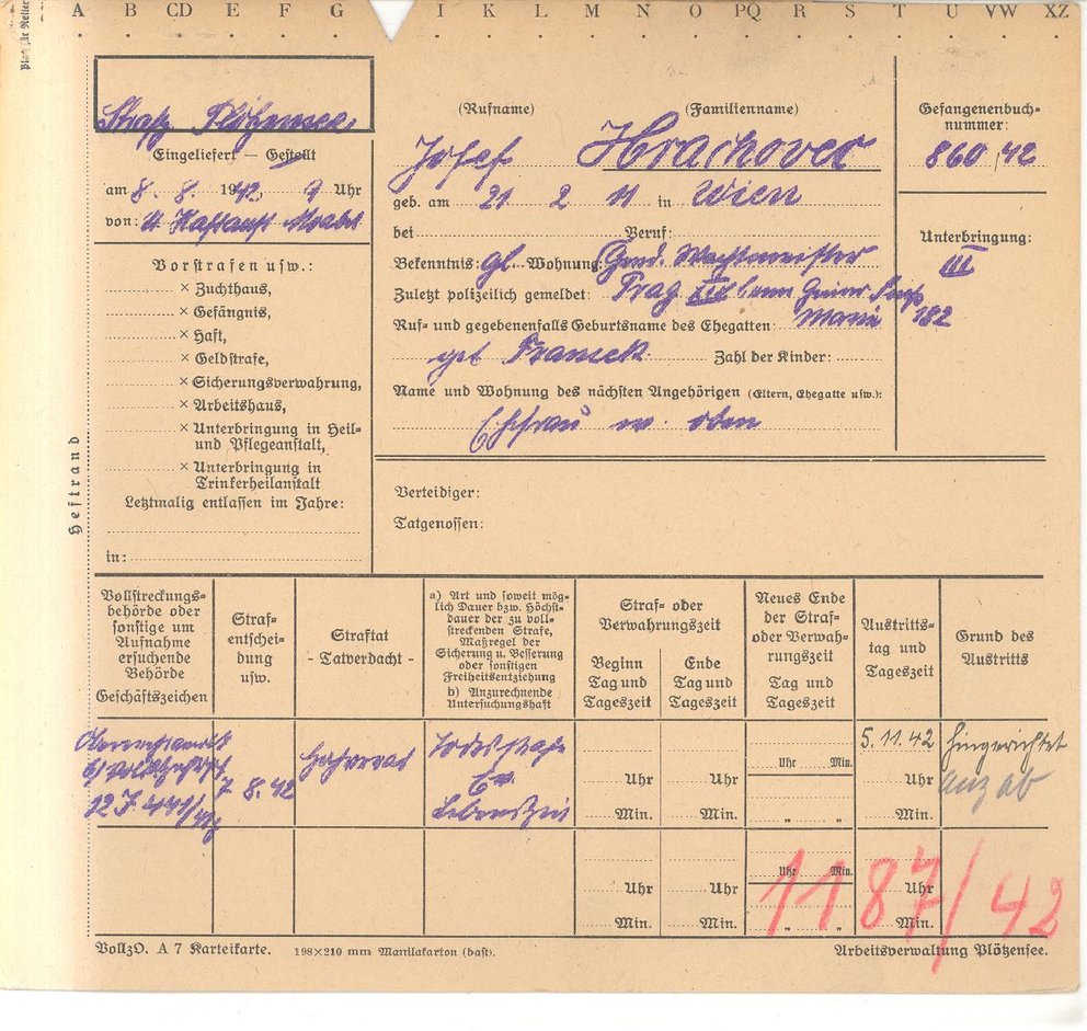 Zatčen 7.9.1943 Stapo České Budějovice Flossenbürg čis. vězně 6093 poté v Litoměřicích 88622 transport G1 Gross-Rosen" vrátil se