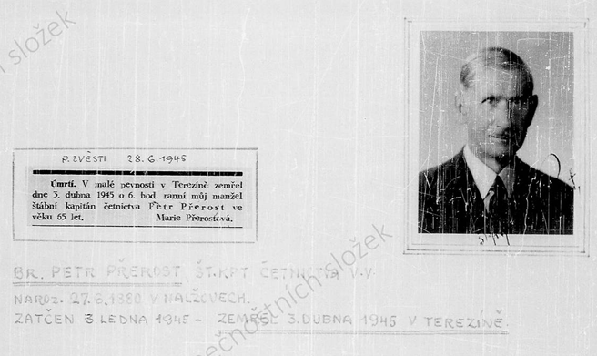 Strážmistr četnictva, Kropáčova Vrutice, zatčen 13. 06. 1944 přežil a vrátil se z Terezína po osvobození.