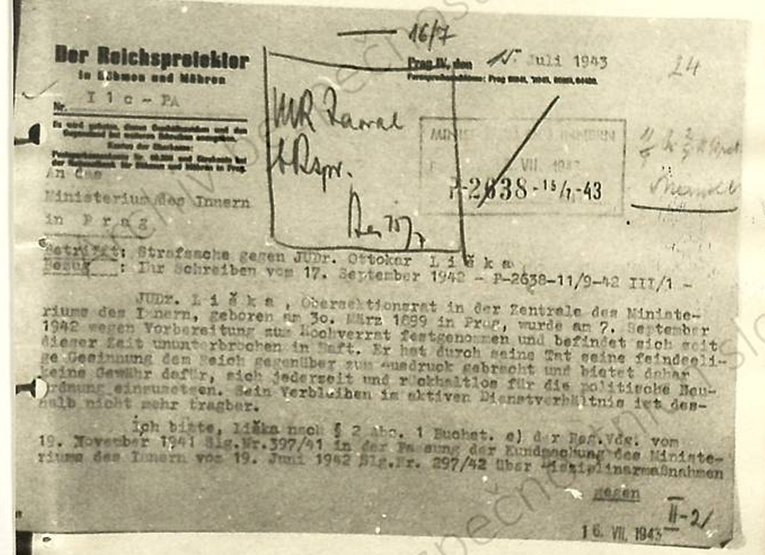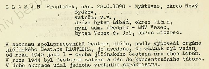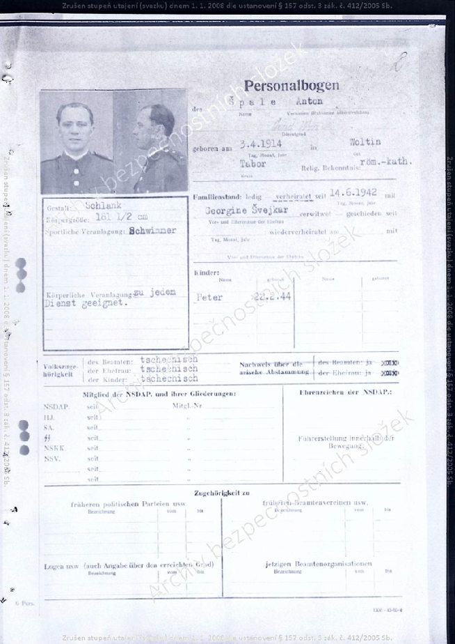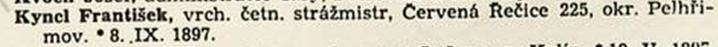Příslušník četnictva stanice Dolní Bukovsko okres Třeboň v Čechách odvelen do četnictva zvláštního oddílu Terezín v Čechách.