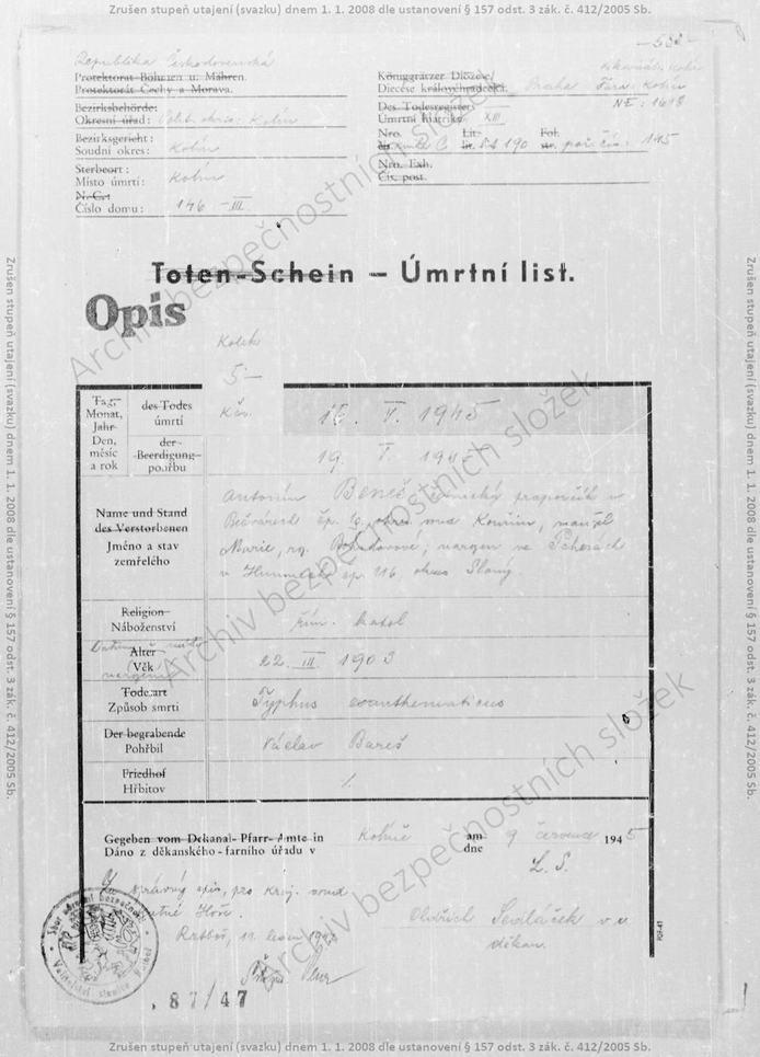 24.6.1910 Panenský Týnec + 18.4.1945 Terezín