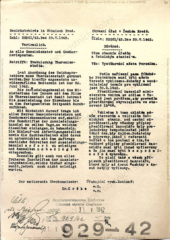 Dne 24. listopadu 1941 odjelo z Prahy do Bohušovic nad Ohří a odtud pak do Terezína tzv. Aufbaukommando tvořené 342 muži, kteří měli připravit přidělené objekty ve městě na své budoucí "poslání". Pravidelné transporty byly zahájeny již posledního listopadového dne. Přestože trvalo déle než sedm měsíců, až do začátku července 1942, než město vyklidila německá armáda a bylo vystěhováno veškeré české obyvatelstvo (asi tři a půl tisíce mužů, žen a dětí), je tento den považován za vznik Ghetta Terezín, kterým do konce války prošlo více než 140 tisíc evropských židů, z nichž na 35 tisíc zde zahynulo. Naprostá většina těch, kteří Terezínem jenom prošli, byla transportována do vyhlazovacích táborů na východě a tam zavražděna.