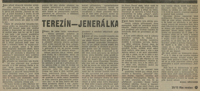 Jako přímý účastník dobrého kolektivu dozorců, jak o tom píše Stanislav Hyksa z České Třebové v HR č. 49/74 pod názvem "Terezín za války" a Josef Schránil z Prahy 4 v HR č. 4/75 pod názvem "Byl jsem na Jenerálce", bych chtěl napsat také něco z naší strany, jak jsme to viděli my. Všech 25 příslušníků bývalého četnictva přišlo na Jenerálku z terezínského ghetta. Konali jsme tam strážní službu a doprovody na různé práce. Já osobně jsem tam byl od 28. 3.1944 a tam jsem také poznal pozdějšího našeho velitele na Jenerálce. Na Jenerálku jsme přišli 1. 5.1944 a za námi pak přijela první skupina 80 vězňů z Malé pevnosti. Mezi nimi byl také J. Schránil. Mohu to napsat s určitostí a přesně, neboť z té doby mám originály seznamů vězňů, které se tehdy sepisovaly. Vzal jsem si jich několik při odchodu z Jenerálky na památku. V seznamech jsou uvedeny i práce, které ten, který vězeň dělal. Hodně vězňů bylo z Prahy, po příjezdu na Jenerálku nás druhého dne přehlédli dva pověstní nacisté, a to šéf gestapa Ernst Gerke a velitel Malé pevnosti Terezín Jöckel. Stručně nás seznámili s našimi povinnostmi a zároveň nezapomněli pohrozit přísnými tresty. V prvé řadě jsme měli bezpodmínečný zákaz hovoru s vězni (jen služebně), zamezit jejich útěku, styku s civilním obyvatelstvem, podporu jídlem atd. Po tomto úvodu a přes všechny vyhrůžky jsme si byli vědomí toho. že ti, které máme hlídat, potřebují naši pomoc. Od této chvíle záleželo na každém jednotlivci v našich řadách, kolik rizika si troufá unést. V prvních dnech se postupovalo opatrně, poznávali se jednotlivci a získávali jsme si důvěru vězňů. přesto, že nám tolik vyhrožovali Malou pevností, podařilo se nám v krátké době propašovat našim vězňům tolik jídla, že netrpěli hladem. Ale tím také nastal problém, co s "domácí" stravou, kterou pochopitelně nikdo nechtěl jíst. Byla vyhazována tak neopatrně, že si toho všimli gestapáci. A tak se potom musela ničit tak, aby po ní nezbyly stopy. Během jednoho týdne věděla snad celá Praha, že v šáreckém údolí na Jenerálce jsou p litičtí vězni z Terezína. Potom teprve začal ten kolotoč s balíčky, které se házely přes plot do zahrady a pak se v příhodnou dobu sbíraly. Píše o tom St. Hyksa ve svém článku, kolik masa, piva a ostatního Jídla jím lidé nanosili. Ovšem my jsme z těch balíčků měli často zamotanou hlavu, hlavně po nedělích, jak toto množství nenápadně posbírat a ukrýt, neboť Jenerálka se stále hemžila gestapáckými pohlaváry. Ale i to se nám dařilo dík dobrému kolektivu vězňů a nás "spoluvězňů", jak nám říkali. Rovněž tak se nám podařilo v krátké době uvědomit hodně příbuzných, zprostředkovat osobní styk, doručování balíků na naše jména a předávání vězňům a umožňovat i různé pracovní úlevy atd. Já sám jsem přijímal balíky na několik jmen vězňů, předával korespondenci a umožnil několikrát styk s rodinami. Hodně už toho z paměti vypadlo, ale aspoň jeden příběh za všechny, jak vězeň Franta Černý svým důvtipem převezl gestapáka Sternkopfa. Byl j to po pěkné májové neděli, kdy hodně návštěv a Pražanů se procházelo kolem zahrady zámečku Jenerálka. Měl jsem službu v zahradě a věděl jsem, kolik proviantu se hromadí kolem plotu. Navečer nebo pozdě večer se to posbírat a odnést nemohlo, vězni už museli být v ubikacích. Zavolal jsem proto Františka Černého, aby vzal koš na záda, srp nebo kosu a šel se mnou na trávu do zahrady. Měl totiž na starosti 2 kozy po bývalém správci zámečku. V zahradě se hned dal do sbírání balíčků. Když byl asi tak uprostřed své práce, zpozoroval Jsem, že do zahrady vchází Josef Sternkopf, to byl zástupce Jöckla na Jenerálce. Dal jsem Černému znamení, pochopil a začal sekat trávu. Sternkopf se však stále pomalu přibližoval směrem к nám. Situace nebyla pro nás nijak příznivá a mohla špatně skončit. František Černý však, když viděl, že Sternkopf se blíží, měl originální nápad: stáhl kalhoty a dřepl do trávy. Sternkopf se zastavil, a když Franta pokračoval ve svém "dřepu", otočil se a vrátil se do zámku. Práci jsme pak v klidu dokončili. Dost často bývaly tyto sbírky proviantu rušeny přítomností dvou gestapáků, kteří na Jenerálce hlídali několik vězňů-prominentů, kterých prý používali pro falešné vysílání do zahraničí. Rádi se procházeli po zahradě. A nyní ještě několik slov к našemu bývalému veliteli. St. Hyksa i J. Schránil píšou o dobrém kolektivu strážců s výjimkou velitele. Nechci mu dělat obhájce. Poznal Jsem ho v Terezíně a pak na Jenerálce. Někdy spouštěl hrůzu, zvláště když nebyl čistý vzduch. Sám jsem ś ním o tom jednou mluvil a on mně odpověděl: "Já vím o všem, co se tu děje a musím něco říct, jinak se nám to rozjede a pozavírají nás všechny a nějak už nikomu nepomůžeme."