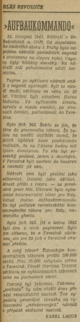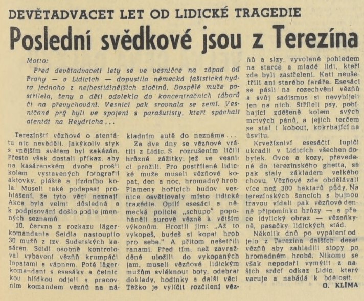 Terezínští vězňové o atentátu nic nevěděli Jakýkoliv styk s vnějším světem byl zakázán. Přesto však dostali příkaz, aby na kasárenském dvoře prošli kolem vystavených fotografii aktovky, pláště a Jízdního kola Museli také podepsat prohlášeni, že tyto věci neznali Akce byla velmi důsledná a k podpisováni došlo podle Jmenných seznámil 10. června z rozkazu lägerkomandanta Seidla nastoupilo 30 mužů z tzv Sudetských kasáren Seidl osobně kontroloval vybaveni vězňů krumpáči lopatami a vápnem Poté lägerkomandant s esesáky a četnickou hlídkou odjeli s pracovním komandem vězňů na nákladním autě do neznáma... Za dva dny se vězňové vrátili z Udic. S rozrušením líčili hrůzné zážitky, jež ve vesnici prožili. Pro postřílené lidické muže museli vězňové kopat, den a noc, hromadný hrob Plameny hořících budov vesnice osvětlovaly místo lidické tragédie. Opilí esesáci a německá policie "schupo" popoháněli surově vězně k větším výkonům Hrozili Jim: "Až to vykopeš, budeš si kopat hrob pro sebe." A přitom nešetřili ranami. Před tím, než zavražděné uložili do vykopaných jam, museli vězňové lidickým mužům svléknout boty, odebrat doklady, hodinky a další věci Těžko Je vylíčit rozčileni vězňů a slzy, vyvolané pohledem na starce a mladé lidi, kteří zde byli zastřeleni. Kati neušetřili ani starého faráře. Esesáci se pásli na rozechvěni vězňů a svůj sadismus si nevybíjeli (en na nich Stříleli psy, pobíhající zděšeně kolem svých mrtvých pánů, a Jejich terčem se stal i kohout, kokrhající na úsvitu. Krvežízniví esesáčtí lupiči ukradli v Lidicích všechen dobytek Ovce a kozy, převedené do terezínského ghetta, se pak staly základem velkého chovu Vězňové zde obdělávali více než 300 hektarů půdy. Na terezínských šancích s bujnou travou vídali pak vězňové denně připomínku hrůzy — a přece Idylický obraz — vězeňkyně, pasačky lidických stád. Několik dnů po vypáleni odjelo z Terezina dalších deset vězňů, aby zahladili stopy po hromadném hrobě. Nikomu se však nepodaří vymýtit z na šleh srdci odkaz Lidic. který varuje a nabádá k bdělosti.